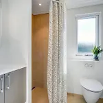 Lovely Home In Vejers Strand With Sauna beschikt over een badkamer met een bubbelbad, een douche en een wasmachine. De badkamers hebben ook een droger voor extra comfort.